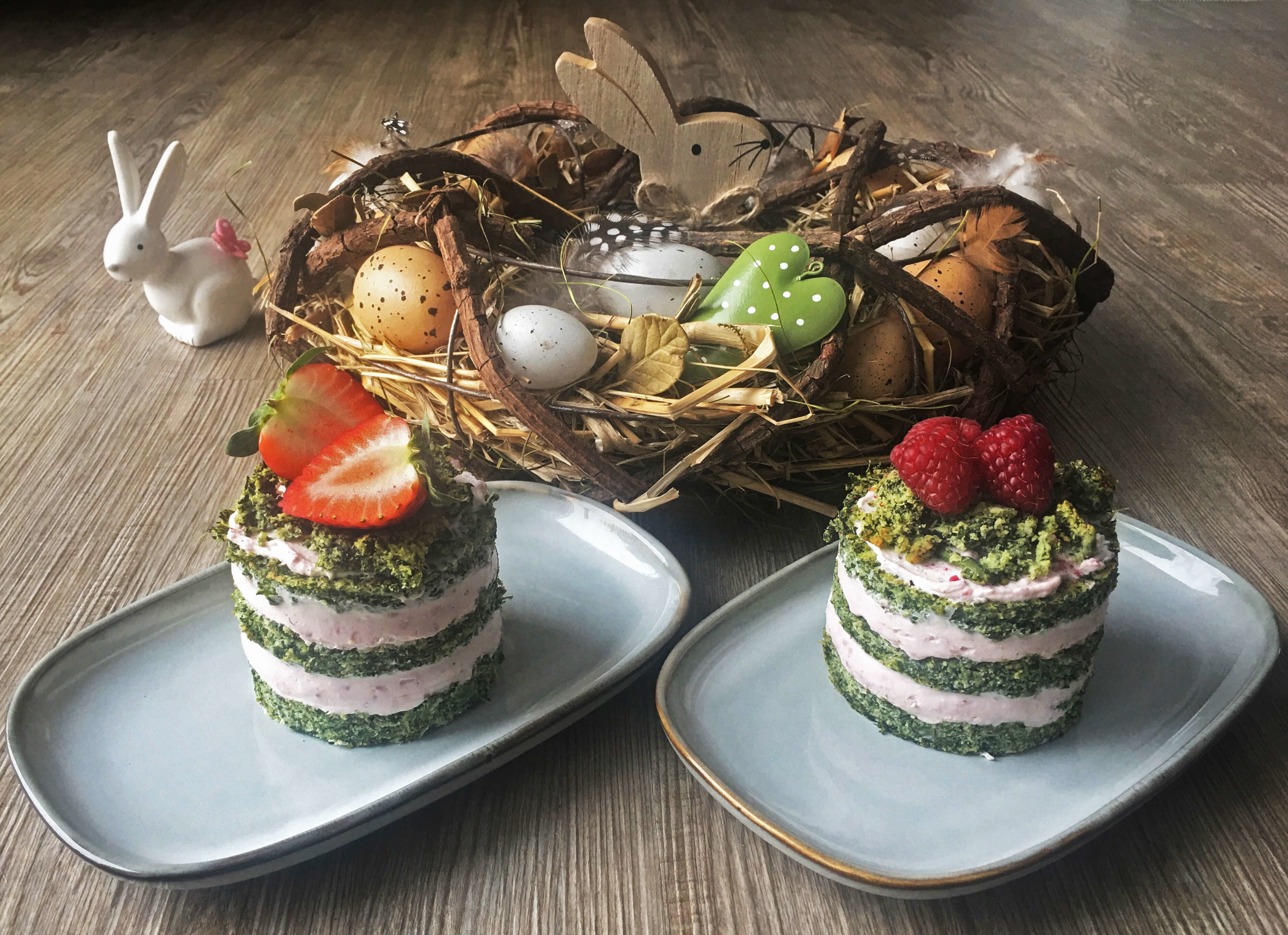 Mražený špenát nechte rozmrznout a přes sítko z něj vymačkejte vodu. Když máte špenát čerstvý, tak ho spařte, rozmixujeme a postupujeme stejným způsobem jako u zmraženého. Bílky vyšlehejte s erytritolem a jednou čajovou lžičkou citronové šťávy do tuhého sněhu. Žloutky vyšlehejte do pěny, přidejte špenát a zašlehejte obě vaječné směsi. Poté jemně spojte a po částech přidejte obě mouky s vinným kamenem. Těsto vylejeme na plech vyložený pečícím papírem a uhladíme. Pečeme na 175 stupňů cca 30 minut. Upečené těsto nechte vychladnout. Vykrajujte stejně velká kolečka a zbytek rozdrobte na krém. Následně dejte všechny suroviny do šlehače a vyšlehejte v hladký krém.