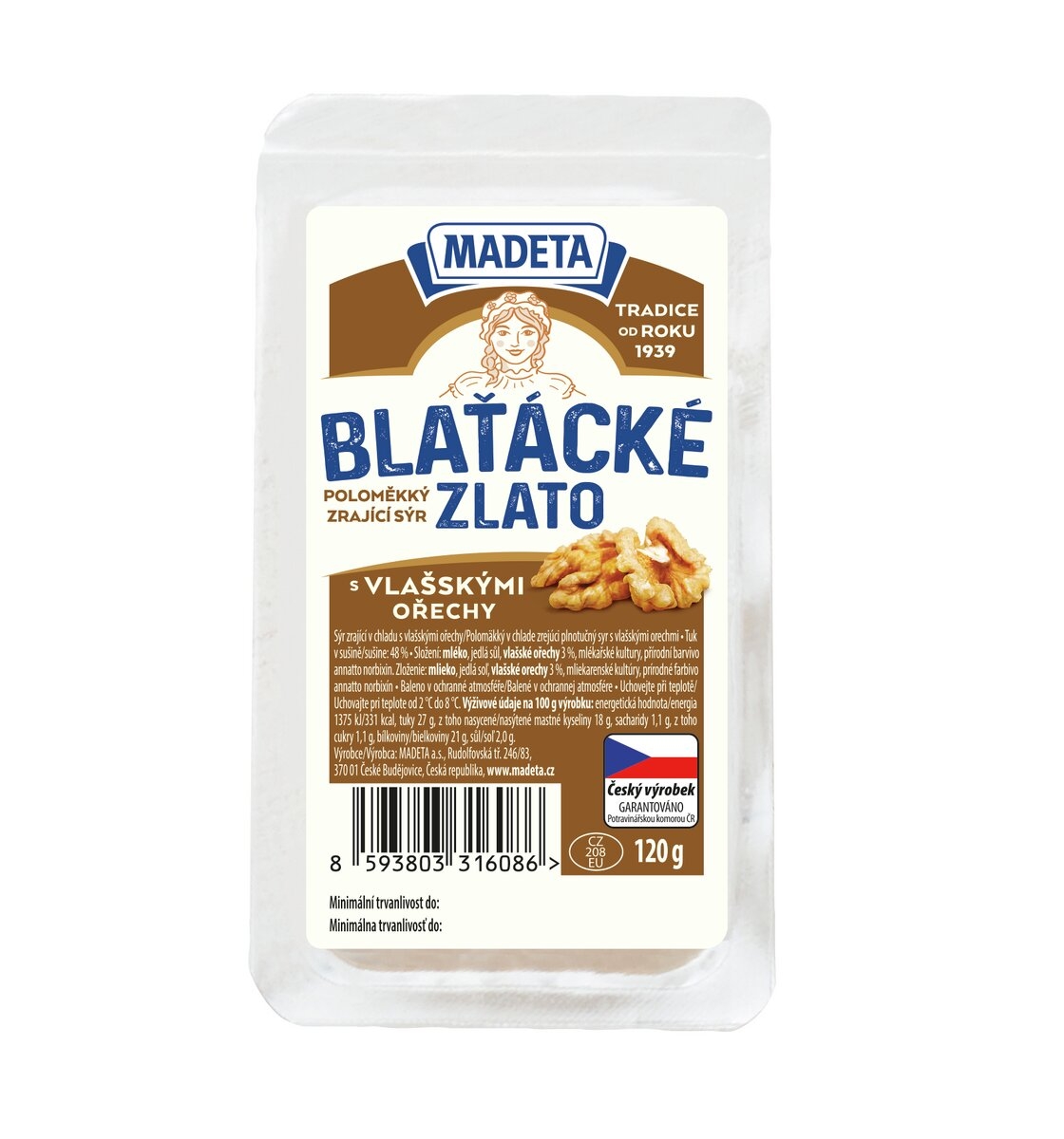 | Ingredients (CZ) | milk, table salt, walnuts (3%) dairy cultures, natural dye annatto |