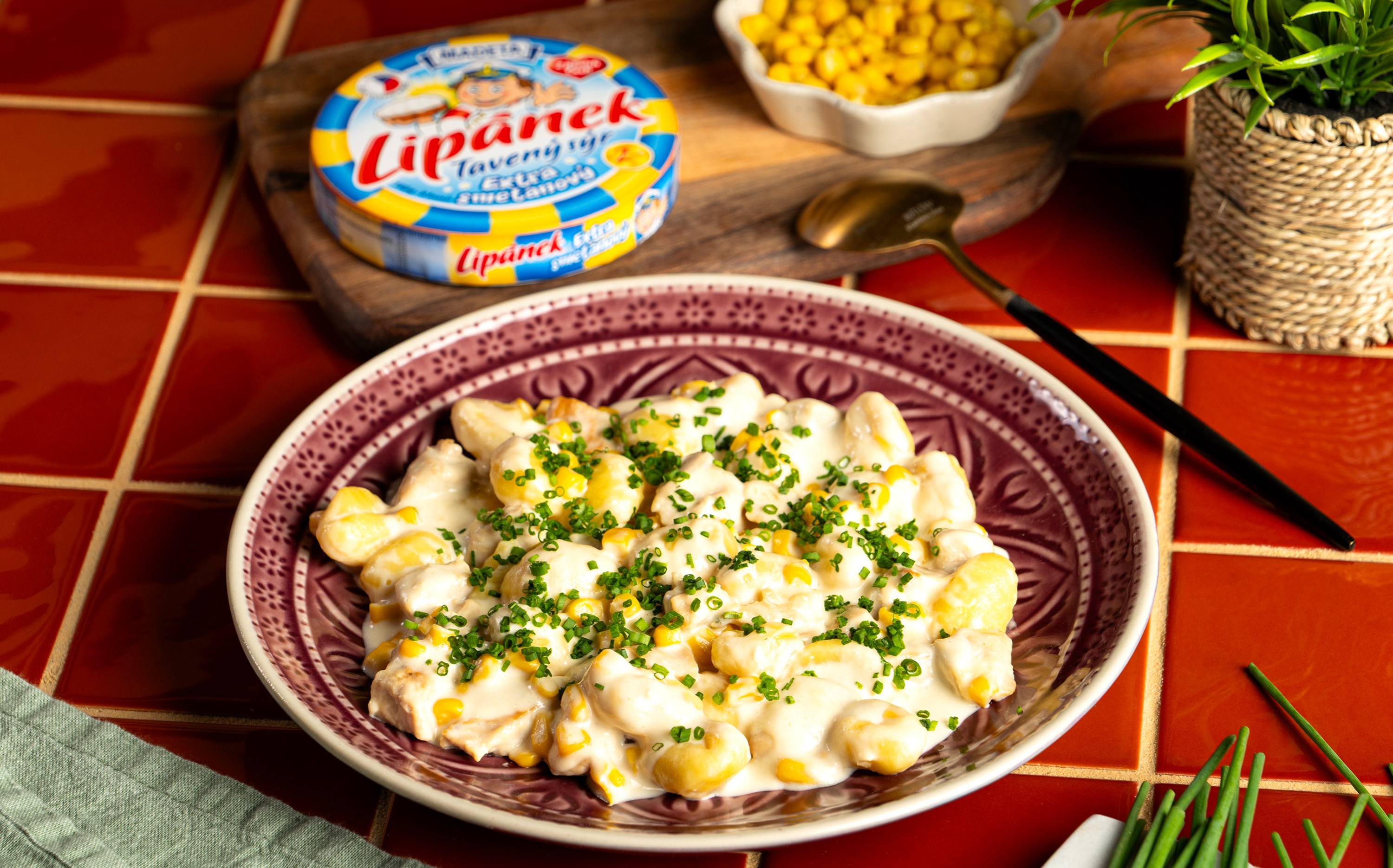 Bramborové noky s kuřecím masem, kukuřicí a smetanovou omáčkou z taveného sýra Lipánek