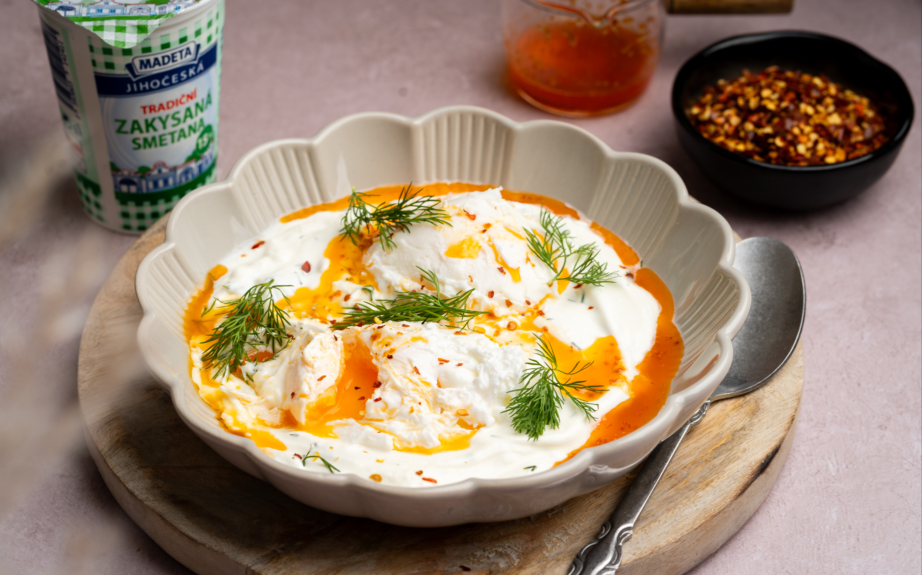 Na talíř rozetřeme smetanový základ, položíme ztracená vejce a přelijeme je teplým chilli máslem. Nakonec ozdobíme čerstvým koprem a ihned podáváme, ideálně s křupavým pečivem.1