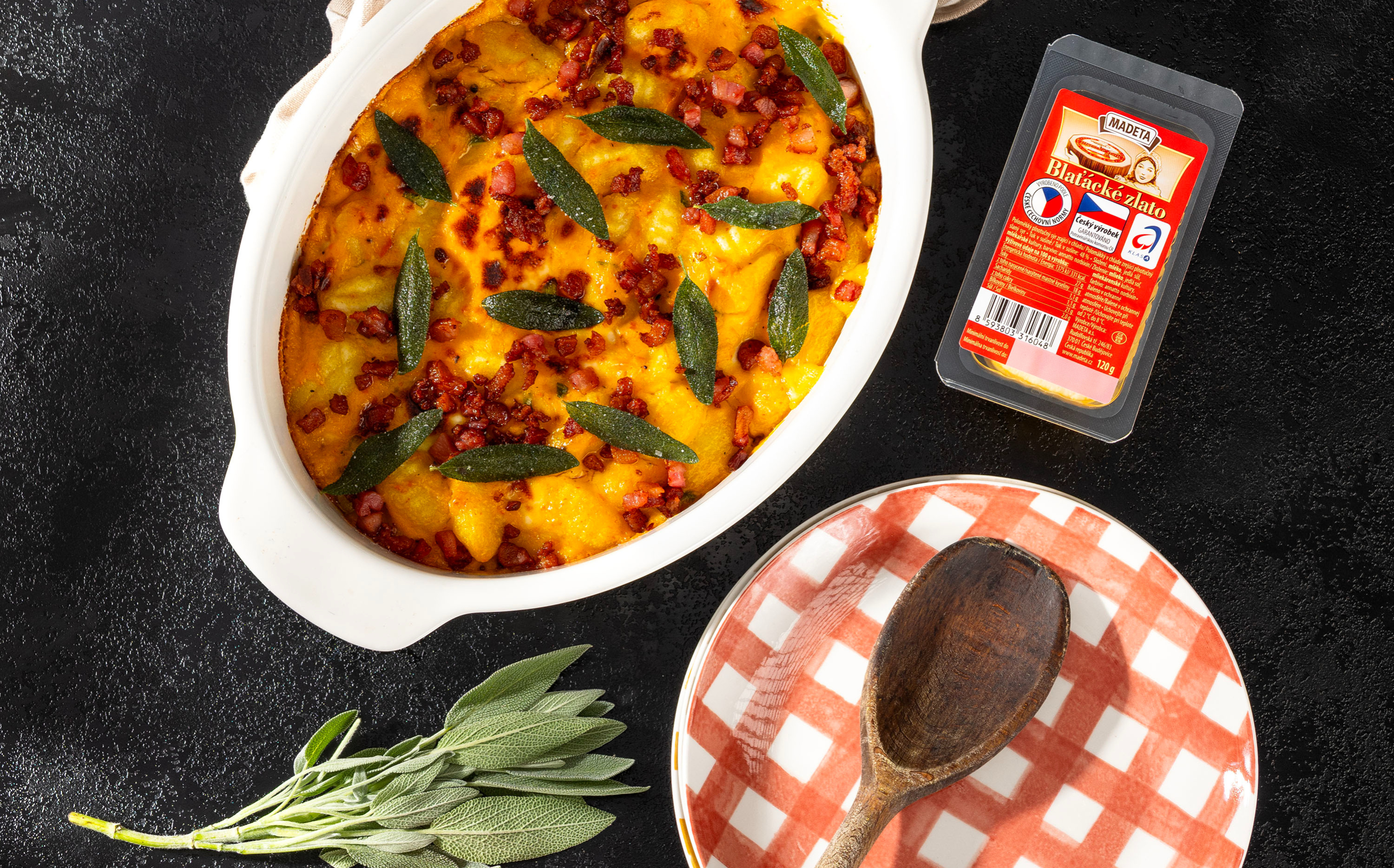 Dýni upečeme i se slupkou doměkka. Poté ji rozmixujeme spolu s čerstvou Jihočeskou smetanou a vývarem dohladka. Gnocchi uvaříme podle návodu, slijeme a smícháme s dýňovou omáčkou a sýrem Blaťácké zlato nakrájeným na kostičky. Přidáme nasekané lístky šalvěje, osolíme a opepříme. Směs přesuneme do zapékací mísy a krátce zapečeme, dokud se sýr nerozpustí a nezezlátne. Na pánvi nasucho osmažíme nakrájené guanciale. V dalším kastrolku rozehřejeme olej a osmažíme v něm šalvějové lístky do křupava. Hotové gnocchi podáváme posypané guanciale a křupavou šalvějí.