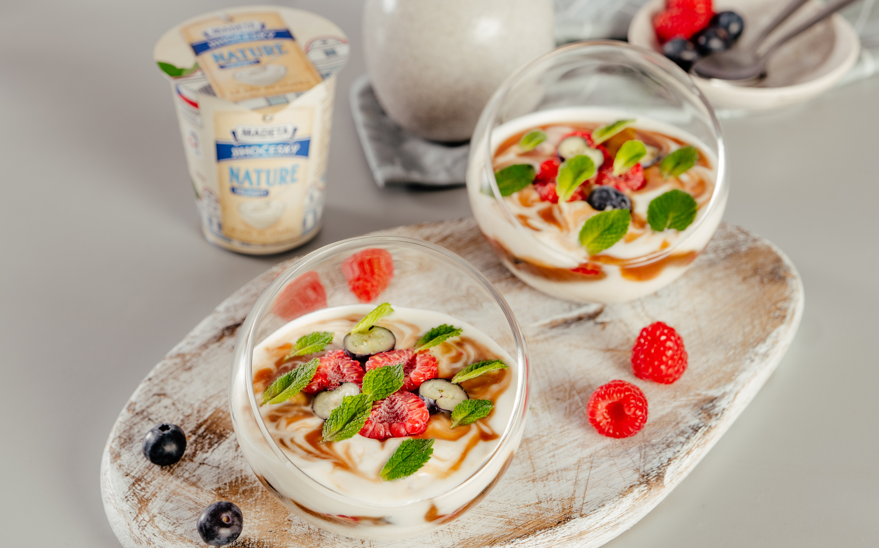Třtinový cukr necháme rozpustit na pánvi. Po rozpuštění pomalu přiléváme smetanu a vaříme do zhoustnutí. Necháme vychladnout a poté smícháme s bílým jogurtem. Ovoce nakrájíme na malé kostičky. Hotovou směs vlijeme do mističek, ozdobíme ovocem a mátou a necháme vychladnout v ledničce.