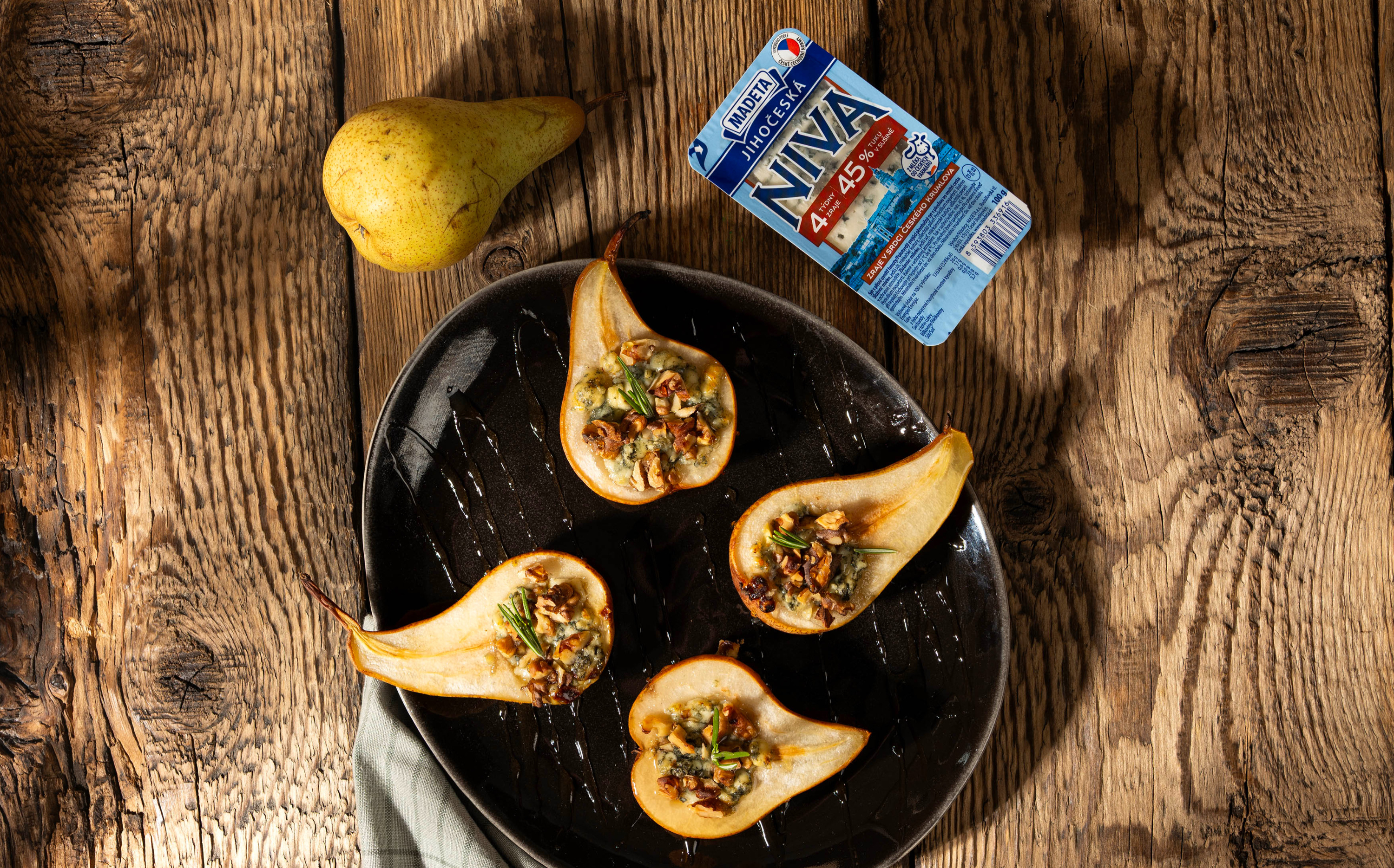 Hrušky rozpůlíme a zbavíme jádřinců. Naskládáme je řeznou stranou nahoru do pekáčku. Do středu každé půlky vložíme kousky Jihočeské nivy, zakápneme medem a posypeme nasekanými vlašskými ořechy. Pečeme v troubě předehřáté na 190 °C asi 20 minut, dokud hrušky nezměknou a sýr se nerozpustí. Podáváme teplé, ozdobené čerstvým rozmarýnem. Hodí se jako elegantní předkrm.