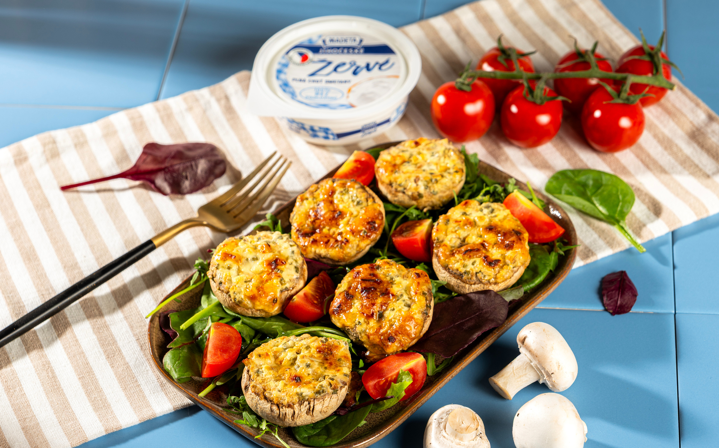 Žampiony očistíme a opatrně vyjmeme nožičky. Nožičky nasekáme nadrobno a smícháme je v misce s Jihočeským žervé, pažitkou, solí, pepřem a případně prolisovaným česnekem. Směsí naplníme dutiny žampionů, posypeme nastrouhaným eidamem a pokapeme olivovým olejem. Pečeme při 180 °C asi 12–15 minut, dokud kloboučky nezměknou a sýr nezezlátne.