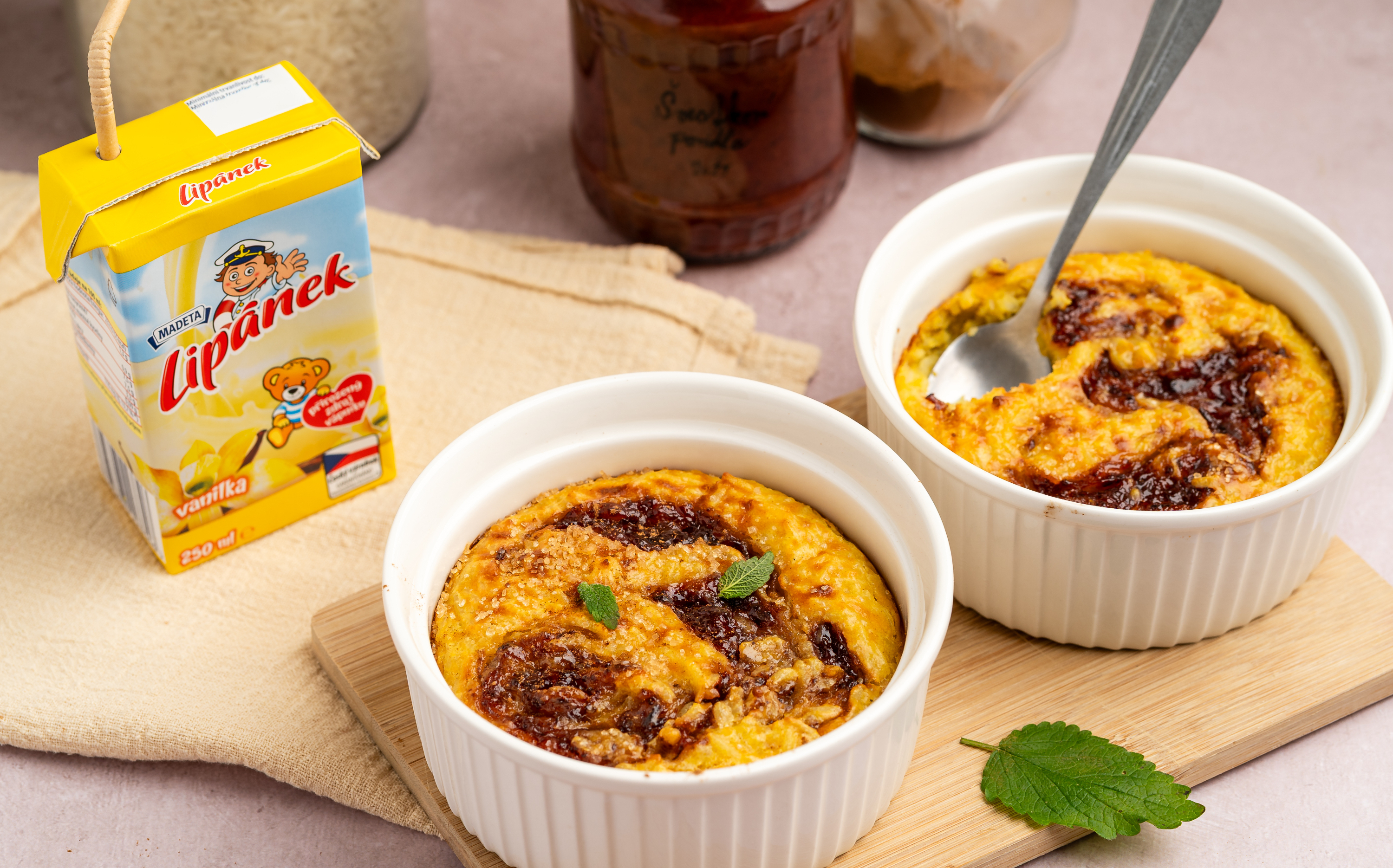 Hotový rýžový pudink přendáme do máslem vymazané menší zapékací misky a povrch potřeme švestkovými povidly. Nakonec posypeme trochou cukru, který při pečení vytvoří jemnou karamelovou krustu.