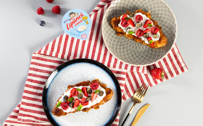 Croissanty rozválíme válečkem na tenkou placku. Na pánvi rozpustíme Jihočeské máslo a croissanty opečeme. Otočíme a polijeme medem. Opékáme, dokud med nezkaramelizuje. Opečené croissanty ozdobíme tradičním Lipánkem, ovocem a mátou.