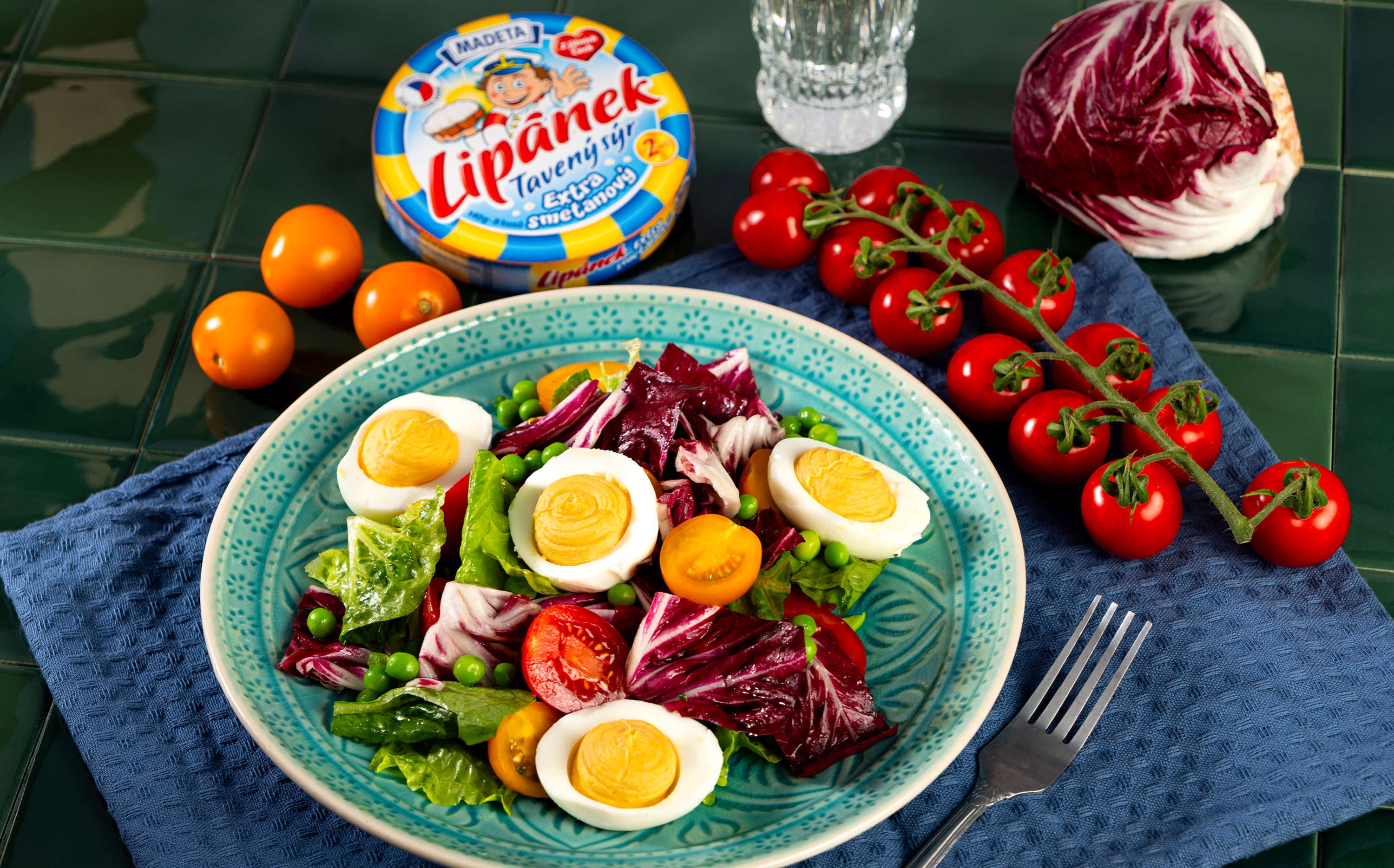 Salát s vejcem plněným směsí ze žloutků, taveného sýru Lipánek a hořčice