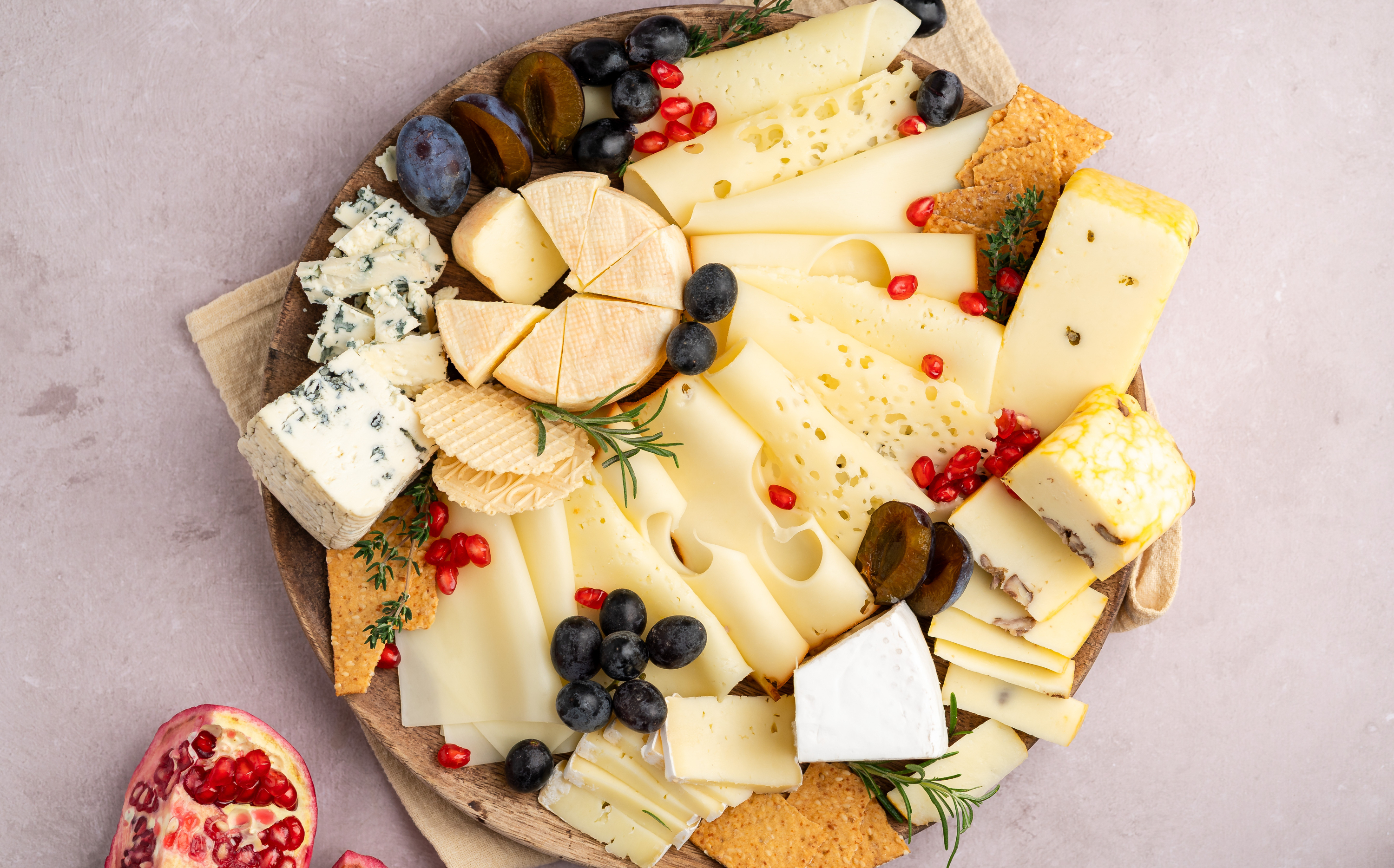Mezi sýry rozmístíme hroznové víno, švestky a semínka granátového jablka. Přidáme semínkové krekry, oplatky a čerstvé pečivo.