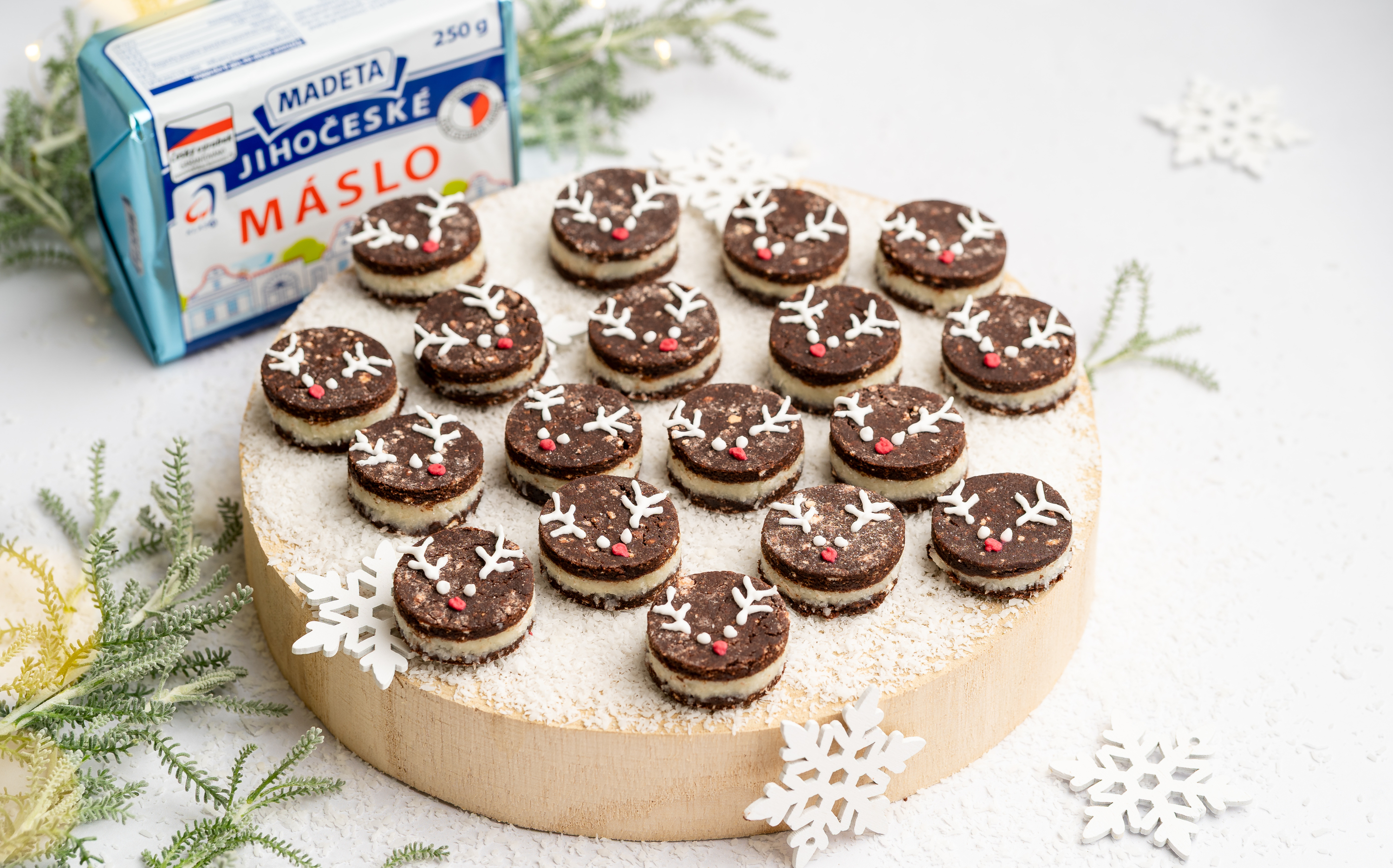 V jiné misce si vyšleháme změklé máslo s cukrem a kokosem. Náplň namažeme na kakaový korpus a druhý plát dáme navrh. Malým kulatým vykrajovátkem vykrájíme kolečka. Položíme je na podložku nebo tác a nazdobíme jako sobíky – připravíme si bílkovou polevu z moučkového cukru, bílku a pár kapek citronu, přidáme červenou tečku jako nos (obarvenou polevu nebo cukrovou kuličku) a necháme zaschnout.