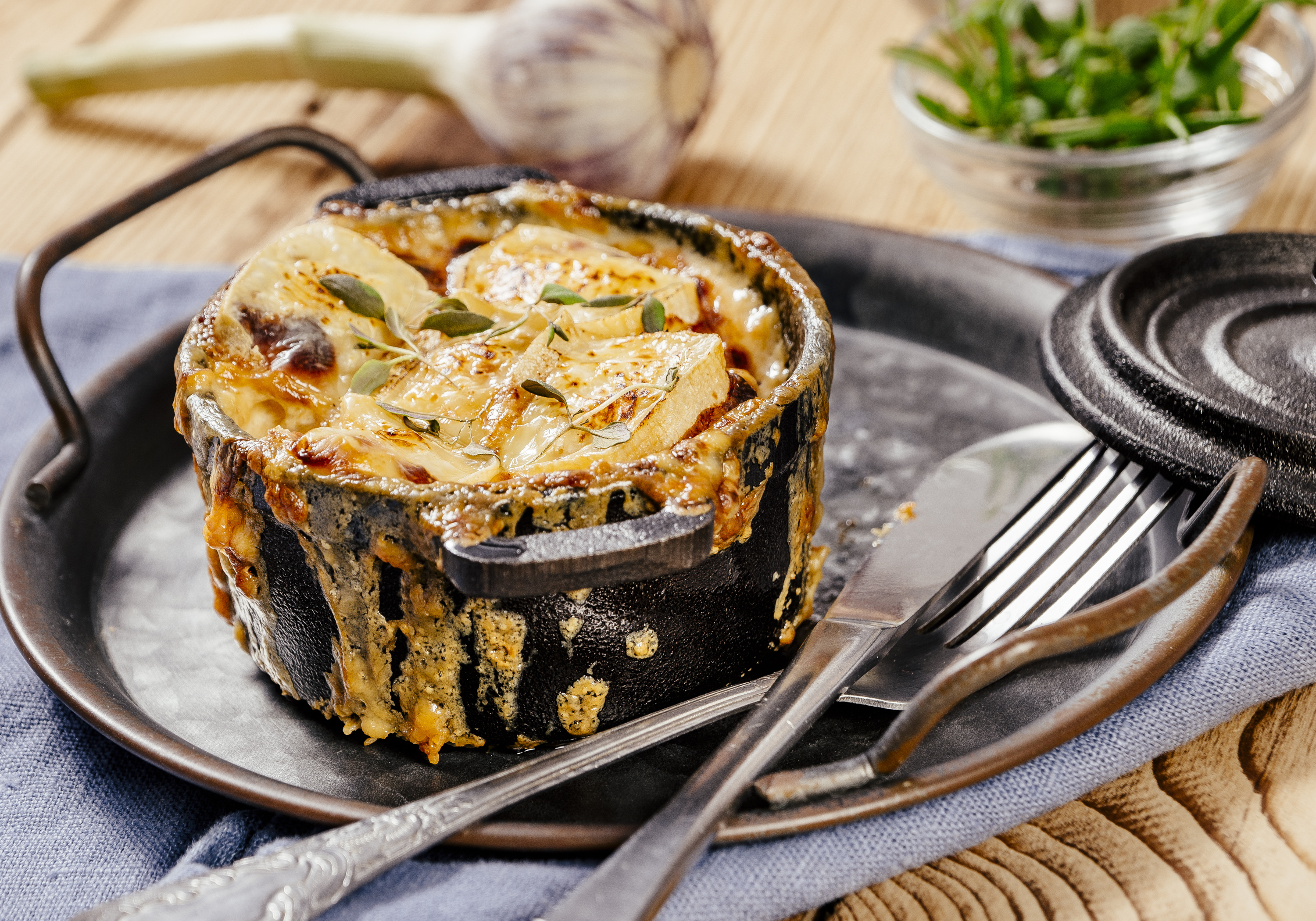 Zapečené brambory se slaninou, cibulí, česnekem a Romadurem