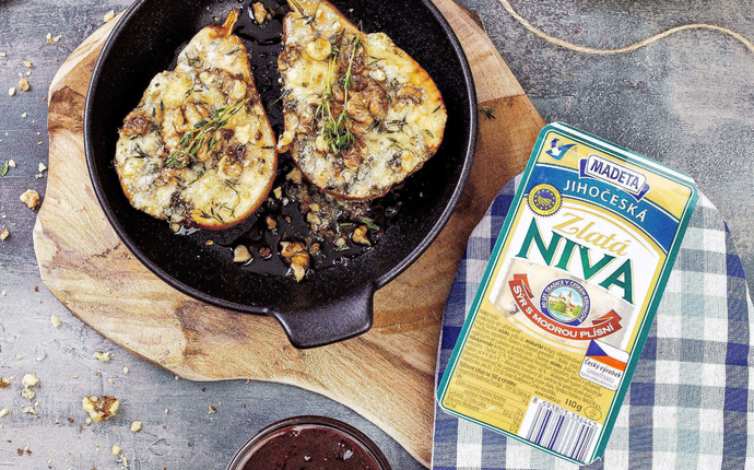 Hrušky opláchneme, rozkrojíme napůl a vydlabeme. Jihočeskou nivu nastrouháme nahrubo a smícháme s hrstkou nasekaných vlašských ořechů, tymiánem, špetkou soli a pepřem. Hrušky naplníme směsí a dáme zapéct na 170 °C. Zakápneme medem a podáváme.